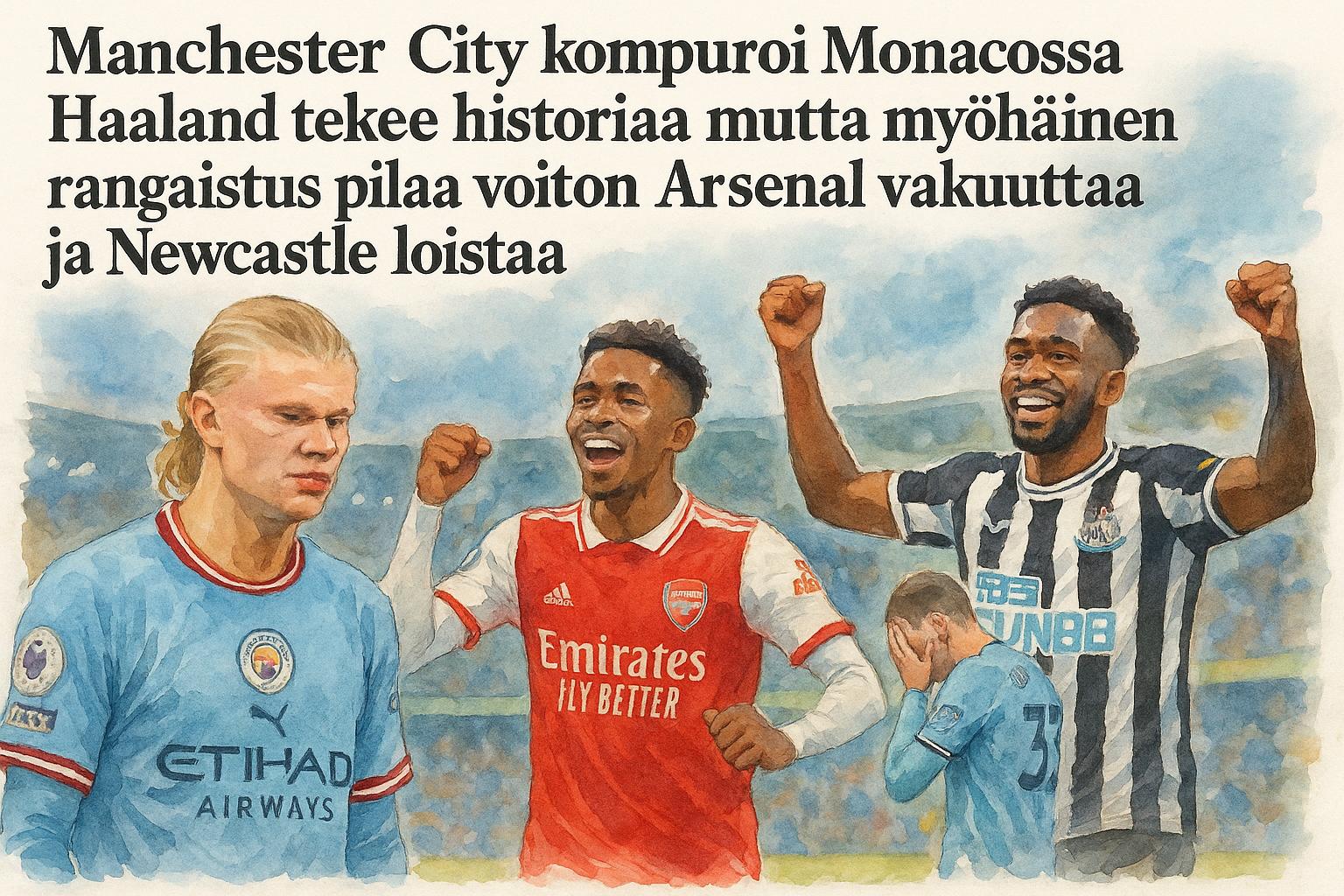 Manchester City kompuroi Monacossa Haaland tekee historiaa mutta myöhäinen rangaistus pilaa voiton Arsenal vakuuttaa ja Newcastle loistaa